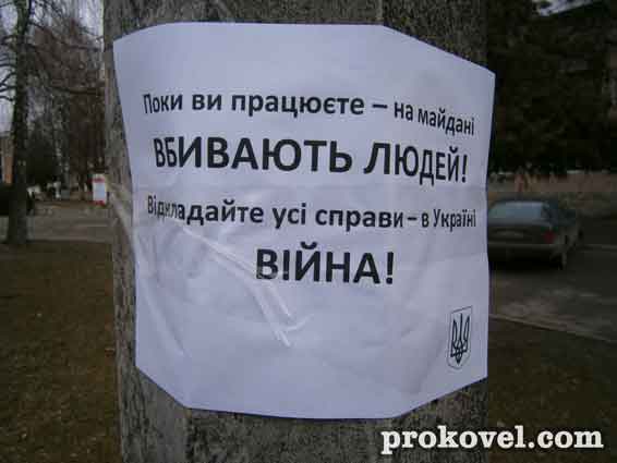 Активісти Євромайдану розклеїли місто листівками з надписом: «Поки ви працюєте – на Майдані вбивають людей! Відкладайте усі справи – в Україні війна!» Окремі підприємці малого бізнесу стверджують, що їх вмовляли на деякий час призупинити роботу і закрити свої кіоски, а якщо вони не прислухаються до порад, то ризикують бути облитими зеленкою. Наразі ще ніхто з тих, хто, так би мовити, ослухався рекомендацій, не постраждав.
