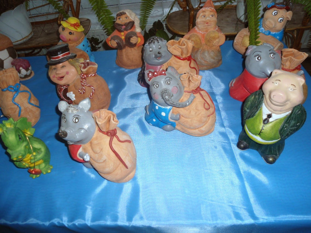 – Глину беру на місцевому цегельному заводі: там є волинська червона і біла зі Слов’янська, – ділиться тонкощами роботи майстриня. – Глинку привожу раз на три місяці, стоїть у мішках у коридорі. Фарби, лак, пензлики треба раз на два місяці докуповувати. Замочую глину у 200-літрових бідонах, настоюю тиждень, щодня кілька разів перемішую. Потім збиваю перфоратором, виходить за густиною як збирана сметанка. Проціджую кілька разів, щоб була однорідна чиста маса. Заливаю в форми на добу. На стінках прилипає по пів сантиметра глини, решту треба злити. До заготовок приліплюю деталі: квіточки, пелюстки, виноград, формую обличчя. Залежно від величини виріб сохне півтора-два тижні.