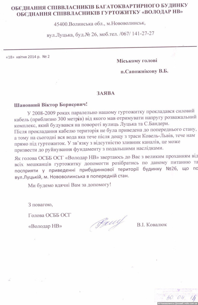 Чиновники своєї відповідальності не визнають. Натомість пропонують нововолинцям скинутися грішми для того, аби зробити водовідвід. Про це йдеться у відповіді спеціаліста відділу будівництва, комунального господарства і газифікації при виконкомі Нововолинської міськради Ігоря Орєхова.