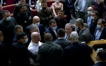 До трибуни пішли нардепи з ОПЗЖ Ілля Кива і Олег Волошин. Сталася штовханина. Їх зупиняли депутати з інших фракцій і груп.