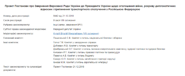 21 грудня 2018 року позафракційний народний депутат Верховної Ради України Віталій Купрій вніс на розгляд парламенту проект звернення до президента України Петра Порошенка з проханням оголосити війну Росії.
