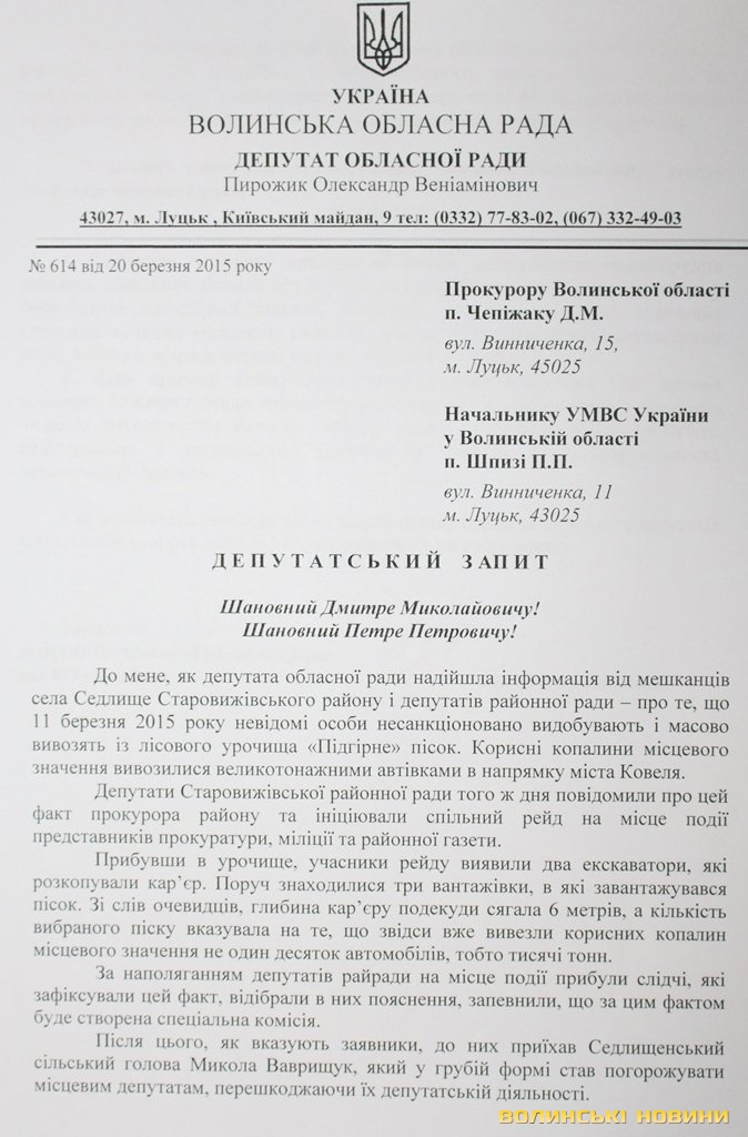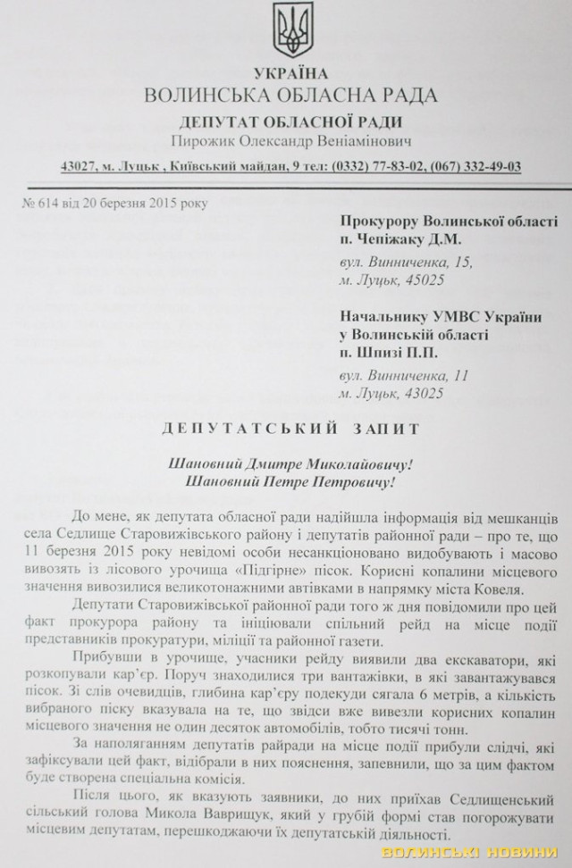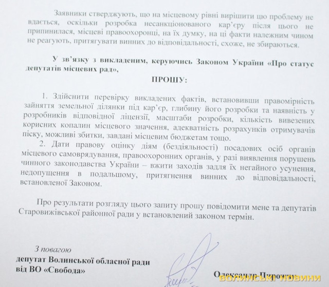Із озвученого запиту Олександра Пирожика, на місцевому рівні розслідування й притягнення до відповідальності винних блокується, розробка кар’єру не припинилася.
