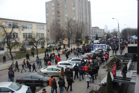 За станом на 14:40 мітингувальники прийшли до СБУ. Радикально налаштованих зупинили представники Народної самооборони в місті.