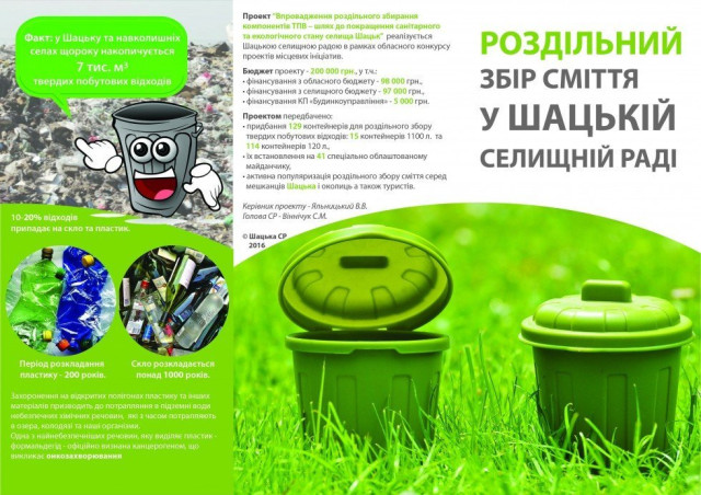 Проект «Впровадження роздільного збирання компонентів ТПВ – шлях до покращення санітарного та екологічного стану селища Шацьк» реалізується Шацькою селищною радою в рамках обласного конкурсу проектів місцевих ініціатив.