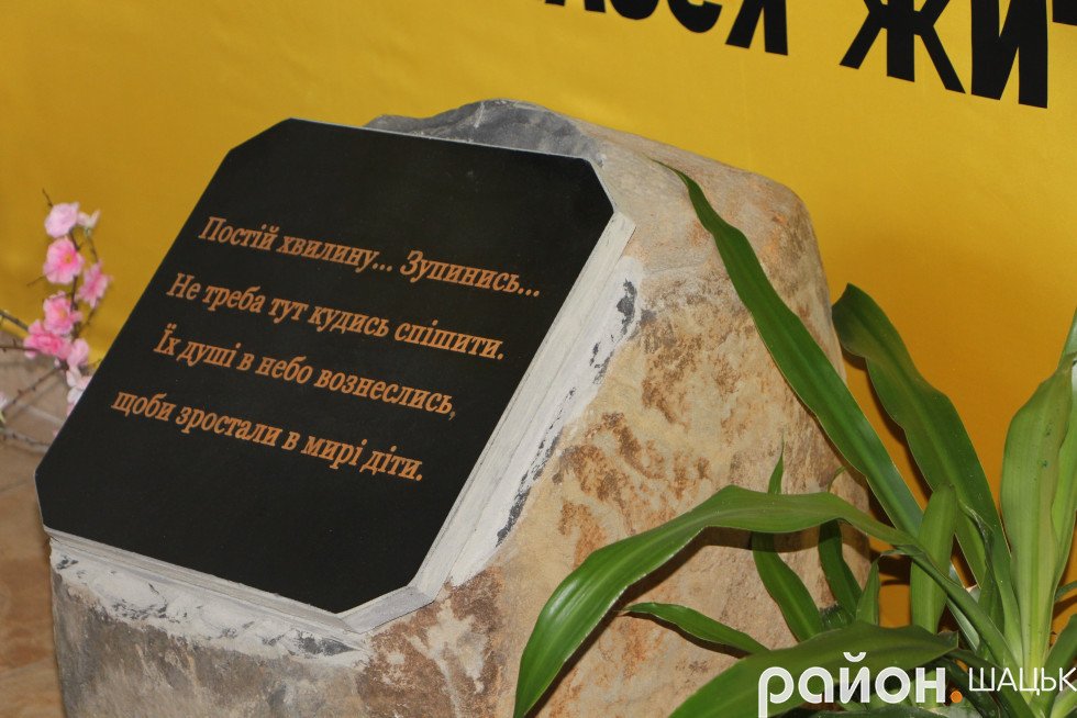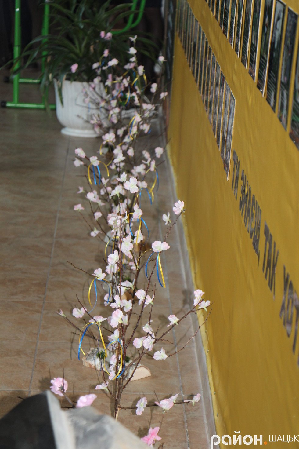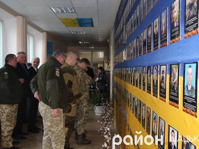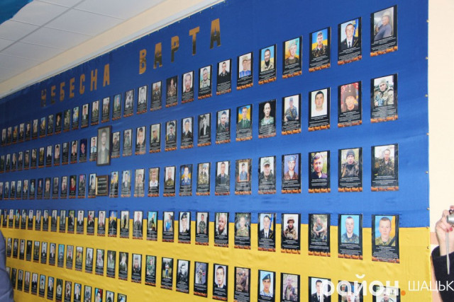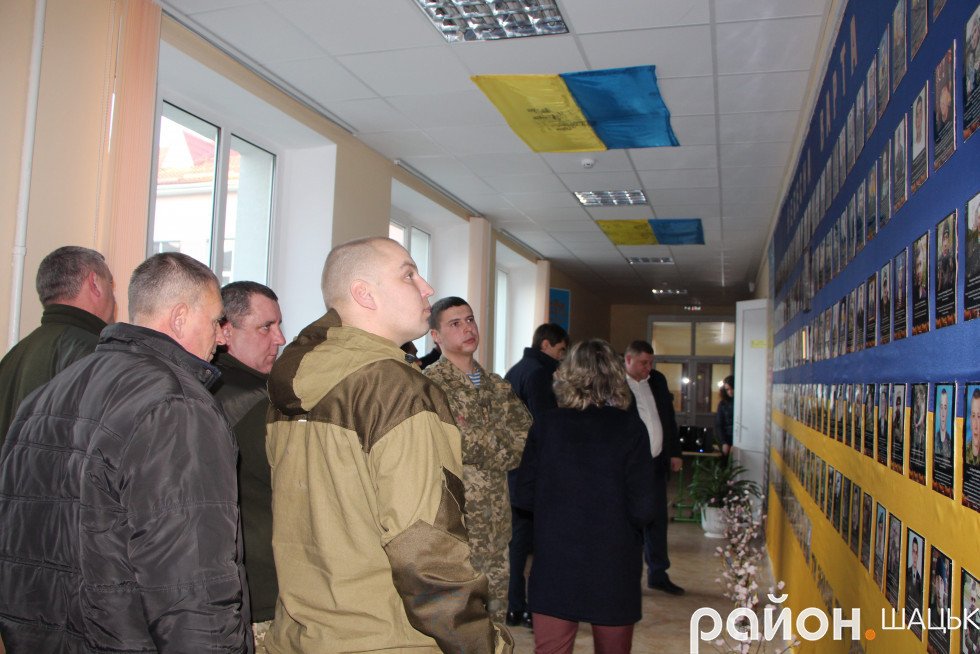 На величезному жовто-блакитному полотнищі розміщені фото майже двохсот волинян, які загинули протягом чотирьох років російсько-української війни, яка триває на сході України. Серед них – портрети двох жителів Шацького району – Сергія Грибука, жителя села Омеляне, та шачанина Сергія Мокренка, який загинув 28 лютого цього року на Світлодарській дузі. Недарма меморіальну стіну дирекція школи вирішила встановити в коридорі поблизу класу, де навчався Герой.