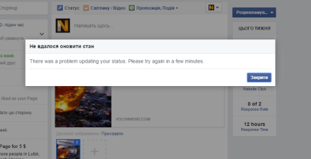 Сторінка весь час видає помилку, зазначаючи, що статус оновити не вдалося і варто спробувати за декілька хвилин. Втім, подібний ефект майже не розповсюджується на персональні сторінки користувачів.