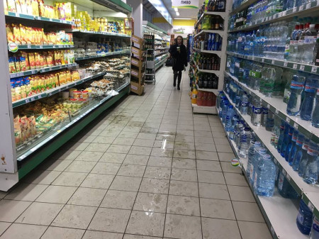 Із самого ранку у супермаркеті «Вопак», який знаходиться в Луцьку за адресою Київський майдан, 11, нестерпний запах та невідома рідина на підлозі. Втім, адміністрація закладу не закриває магазин та відмовляється коментувати.
