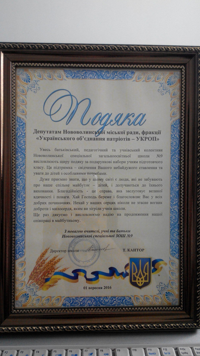 У деякі навчальні заклади укропівці завітали з подарунками. Зокрема для першокласників школи села Прилісне депутат обласної ради Іван Киричик закупив канцелярські набори. У Нововолинську у школі №4 депутати міськради фракції «УКРОП» подарували дитячу літературу для поповнення бібліотечного фонду, а першокласникам спеціалізованої міської школи №9 – конструктори «Лего».