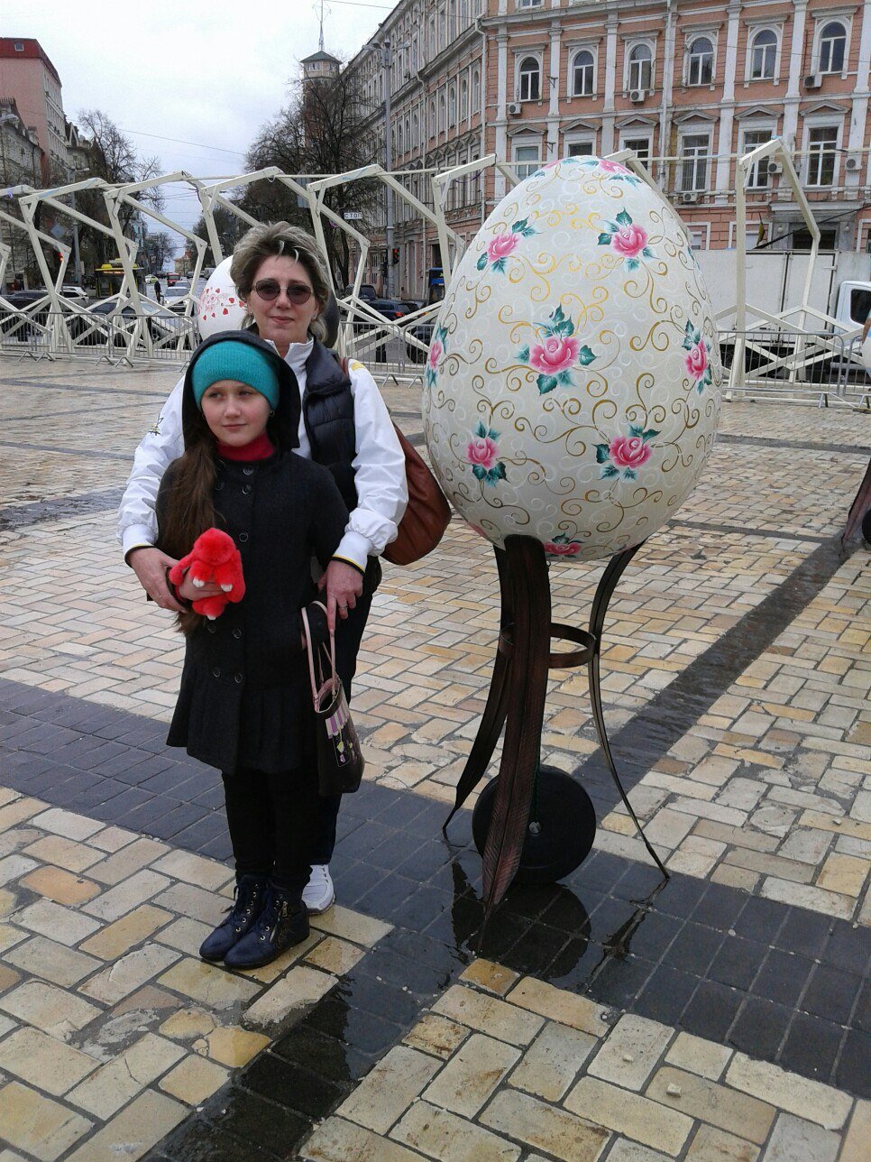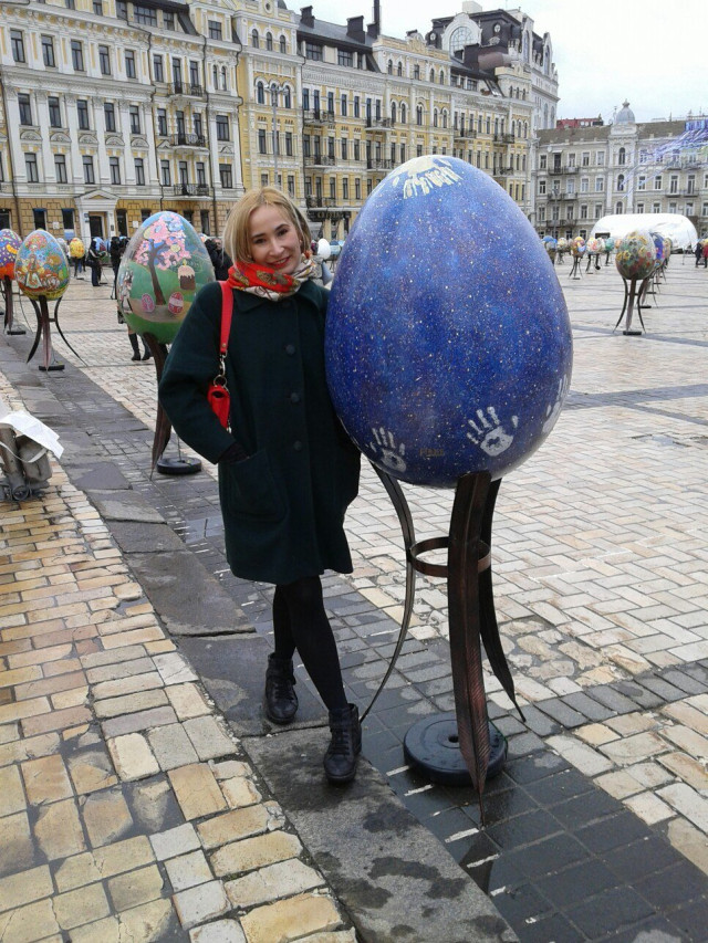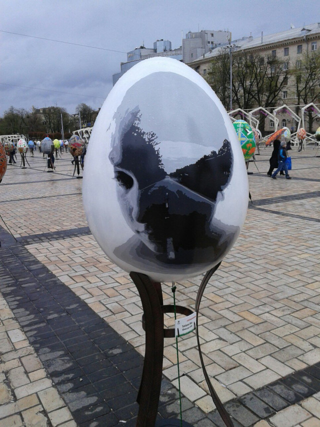Біля входу поставили писанку в краплях з відбитками рук. Це робота дизайнера масок Марини Лапи.