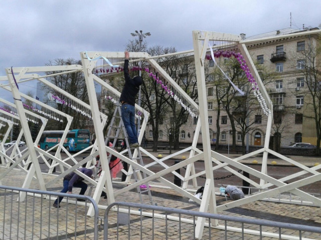 На Софійській і Михайлівській площах та Володимирському узвозі готуються до відкриття всеукраїнського фестивалю писанок та Арт-перфомансу «585 Художників». Виставка мала відкритися 8 квітня, але її перенесли на два дні через дощ, повідомляє Gazeta.ua.