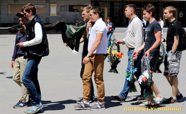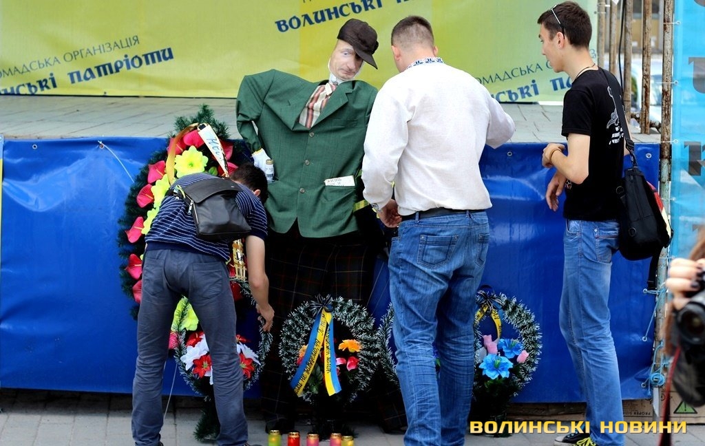 Колона молодих людей йшла похоронною ходою із вулиці Лесі Українки до сцени Євромайдану під марш. Потому, як «Путлєра» встановили біля сцени – люди почали покладати до нього вінки, на стрічках яких пише «Ніколи не забудемо, 49» (ред. «49» - кількість загиблих військових на збитому літаку Іл-76).