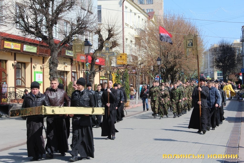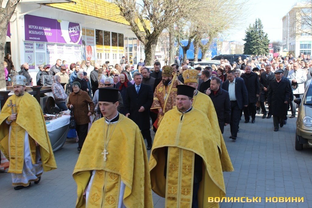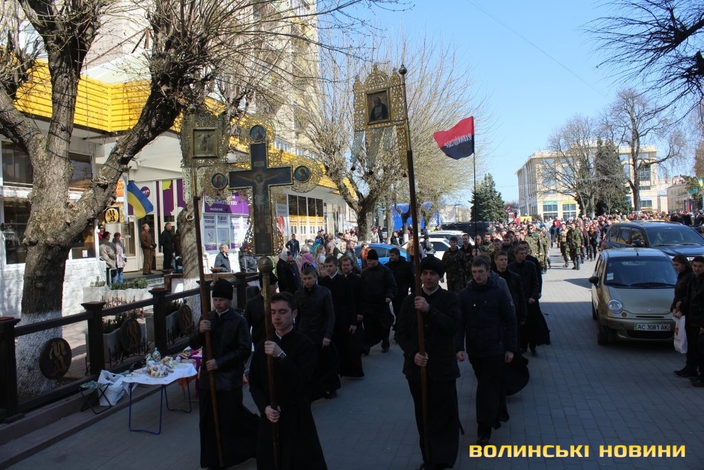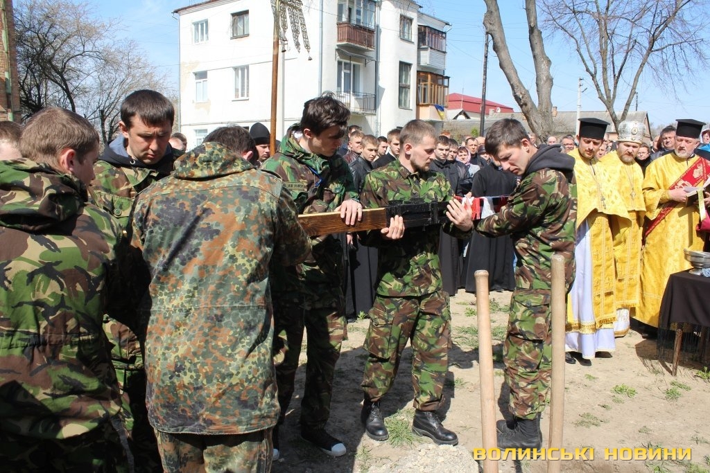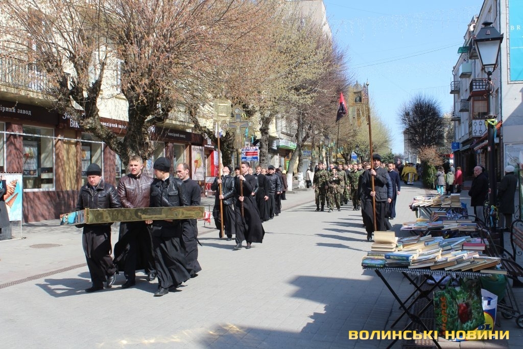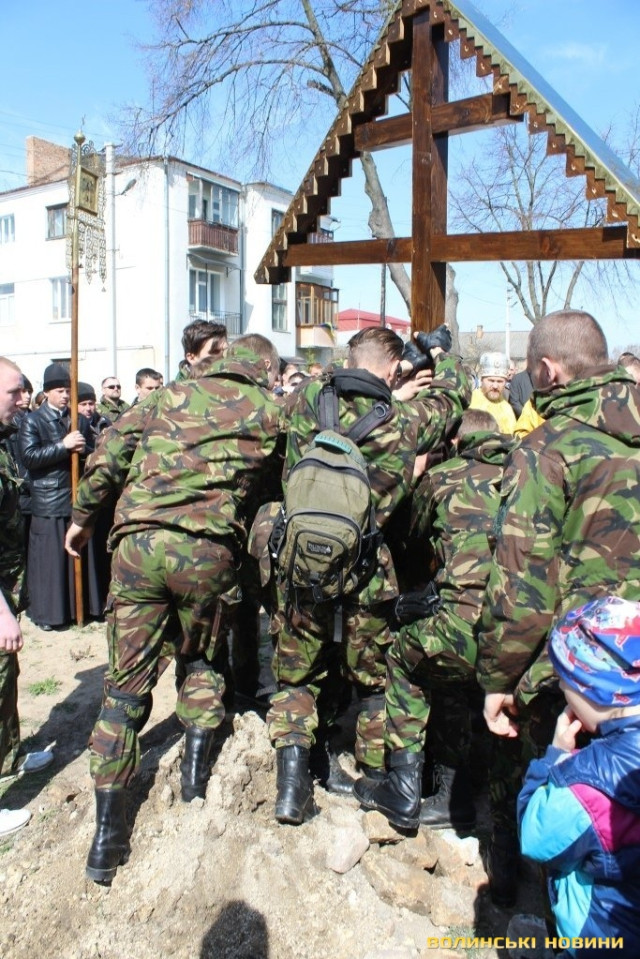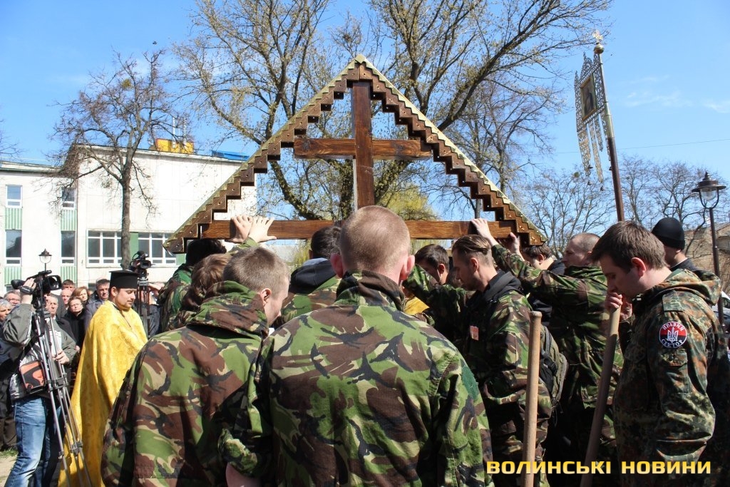 Участь у хресній ході взяли представники Правого сектора, вони ж встановили хрест на місці, де повинен постати храм. Чотири наріжні камені майбутнього храму встановили директор ДКП «Луцьктепло» Олександр Киричук, який, зі слів митрополита Михаїла, став ініціатором побудови храму, керівник Правого сектору на Волині встановили Павло Данильчук, голова ОДА Григорій Пустовіт та міський очільник Микола Романюк.