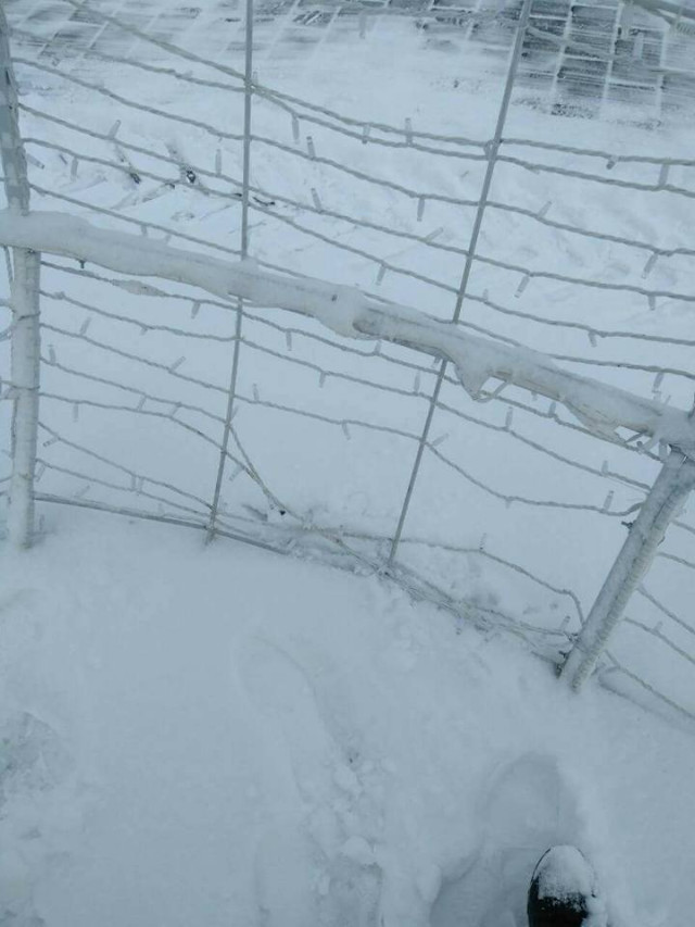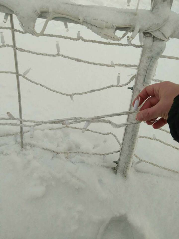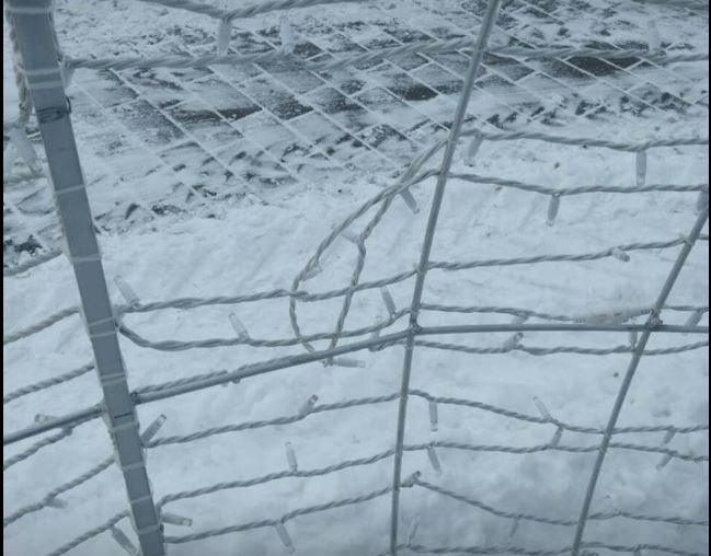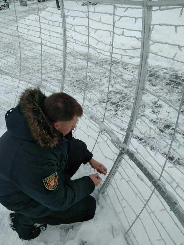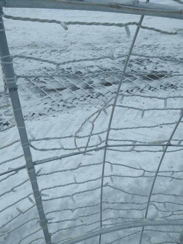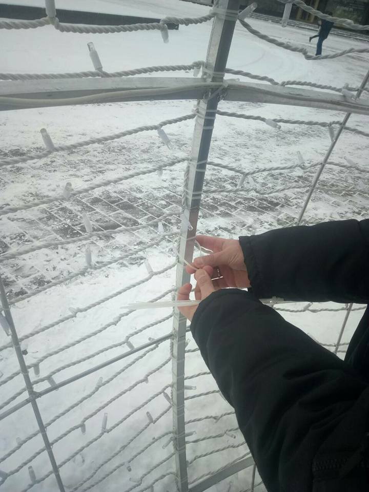 Святкову кулю попсували діти, адже на снігу чітко видно сліди від дитячого взуття. В ілюмінації порвано кріплення та гірлянди.