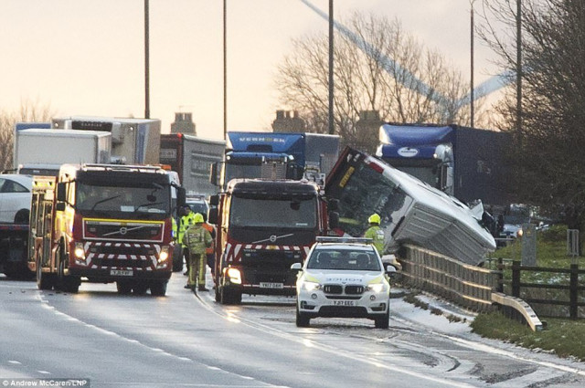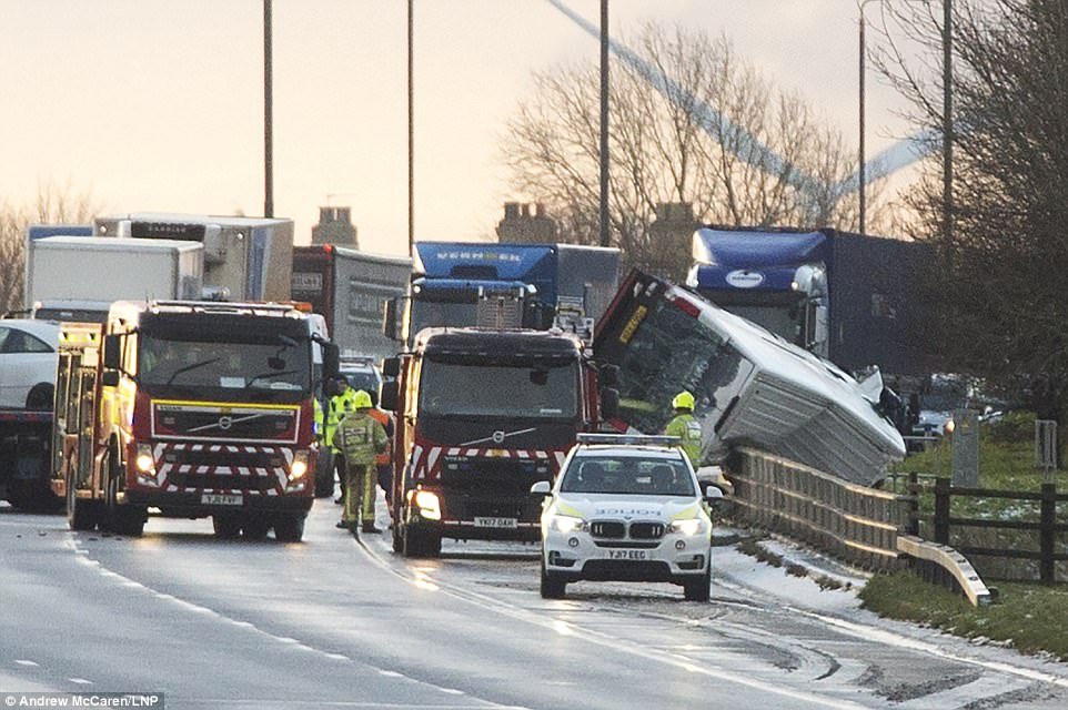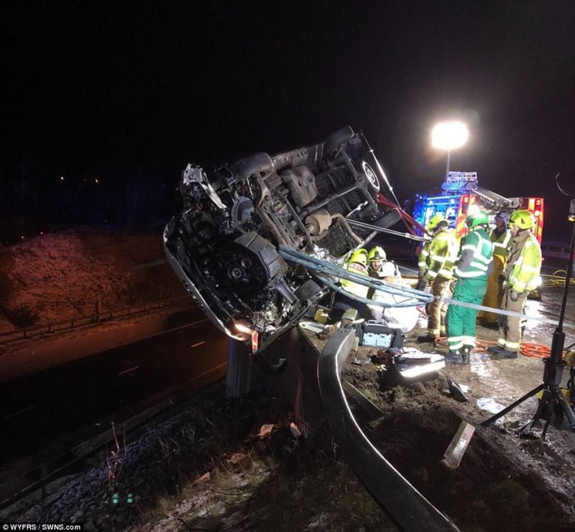1st on the scene of this collision on the #A1M this morning and faced with a vehicle balancing over the edge of a bridge with the driver trapped! After holding on to the vehicle to stop it swaying in the wind I can't begin to desribe my relief when @WYFRS arrived on scene! pic.twitter.com/E8ilktlOl7