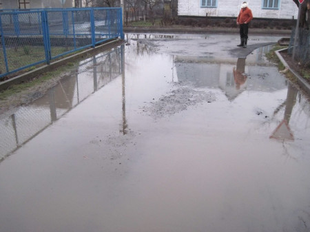 Зі слів фахівців з УЖКГ міськвиконкому заасфальтована вулиця - це ще не «квітка». Роботи мають продовжитися після 10 березня ( якщо погода дозволить). У мене виникає запитання, а чому цей проміжок часу з 18.12 до 10.03 мешканці вул. Б Хмельницького які проживають у «долинці» повинні, надриваючись,виконувати дурну роботу з лопатами і помпами, витрачати сій час , нерви і здоров’я , перекачуючи «озеро» на іншу сторону асфальту?