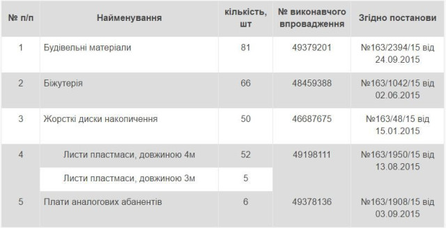 Відповідну інформацію розмістили на порталі електронних торгів арештованим майном 14 липня. Усього в переліку 5 позицій. Для отримання речей можна звертатися до 14 серпня цього року за адресою: м. Володимир-Волинський, вул. Ковельська, 35, т/ф (03342) 3-85-16, 2-48-45.