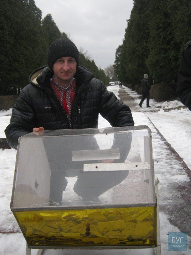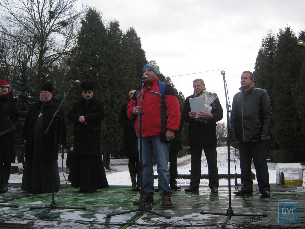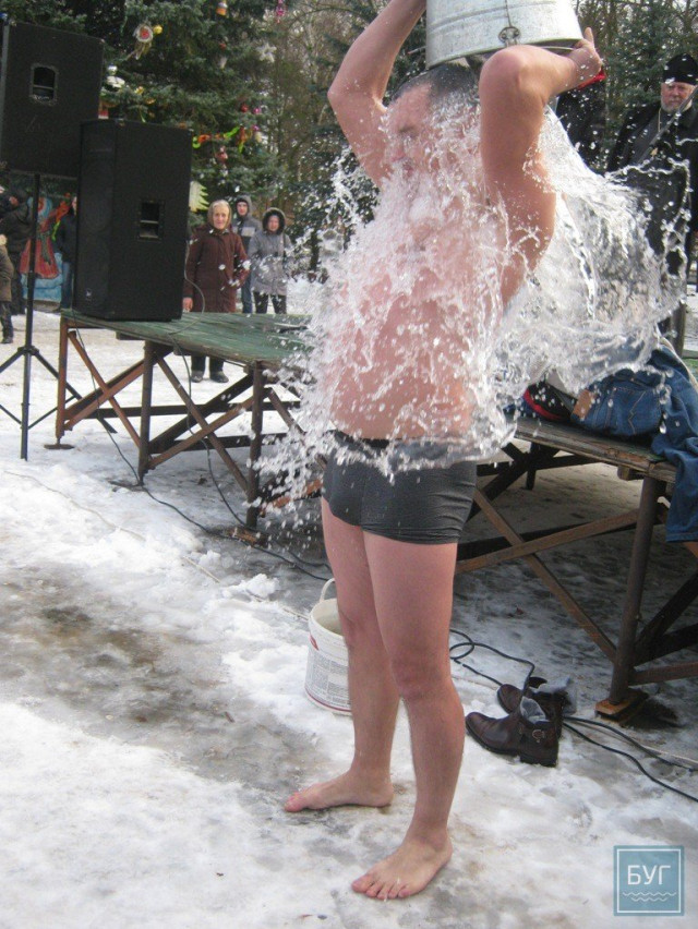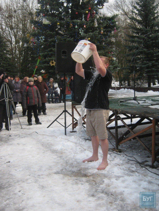 При цьому Андрій поволі знімав із себе зимовий одяг та розповідав про умови акції, суть якої у тому, щоб на очах у глядачів сміливо облитись відром крижаної води, віддати на армію 100 гривень та передати естафету наступним двом учасникам. Якщо ж учасник відмовляється обливатись, то віддає на армію – 500 гривень. Це дійство від 9 січня відбуватиметься щодня о 13 годині на майдані перед адмінбудинком. Перші четверо хлопців-добровольців сміливо продемонстрували, як це робиться. Наступного дня бажаючих побільшало…