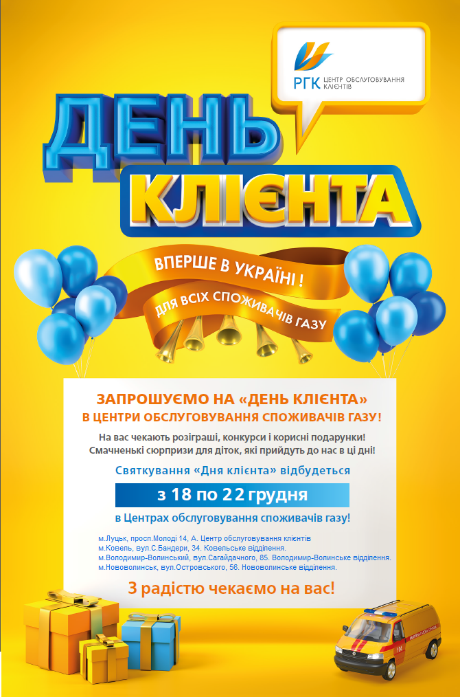 Взяти участь у святкуванні «Дня клієнта» матимуть змогу всі споживачі, котрі в дні проведення завітають до Центру обслуговування та абонентських відділів. На клієнтів чекають розіграші та подарунки від компанії: фірмові чашки, ялинкові прикраси, магніти та наліпки з корисною інформацією. Окрім того, смачненькі сюрпризи та повітряні кульки отримають і наймолодші – дітки, котрі разом з батьками прийдуть в Центри обслуговування.«Уперше ми проводимо для наших клієнтів таке свято, дати обрані не випадково, адже передноворічний час – час подарунків. Ми дбаємо про наших клієнтів і саме тому вирішили потішити їх і зробити приємність – організувати ось таке свято», - каже начальник управління клієнтського сервісу ПАТ «Волиньгаз» Юрій Петрук.