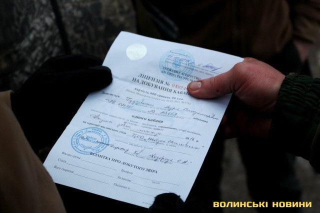 Проїхавши далі, в урочищі Майдан активісти виявили автівку із мисливцями, які назвалися мешканцями Львівської області. Перевіривши документи чоловіків, активісти з’ясували, що вони справді мають ліцензію на відстріл кабана (тушу впольованої тварини виявили у спеціальному приміщенні неподалік). На запитання, чи варто полювати, коли в країні триває війна, мисливці, переконували, що активно підтримують бойові підрозділи, зокрема, батальйон «Айдар», 80-у аеромобільну бригаду та бійців Правого сектора.