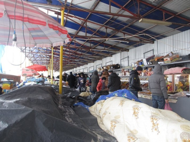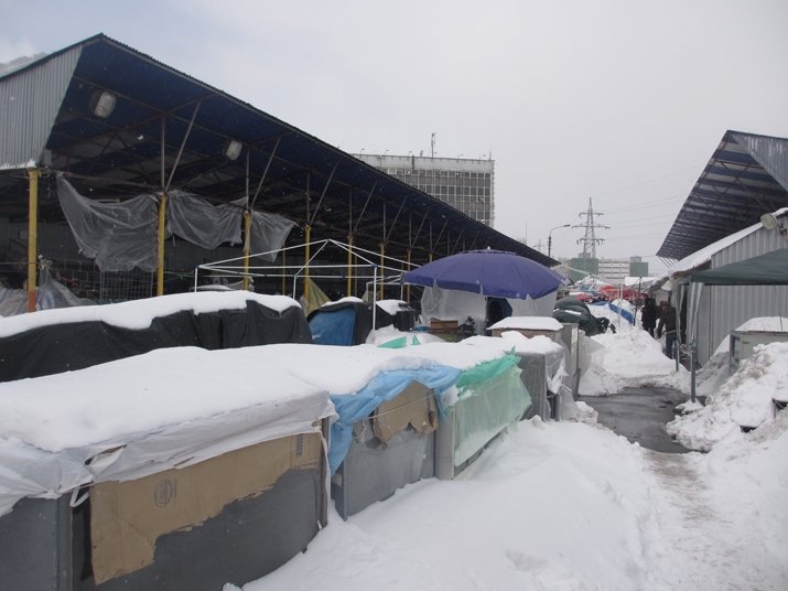 Деміївський ринок у неділю: одиниці продавців і покупців, прилавки, засипані снігом або вкутані ковдрами.