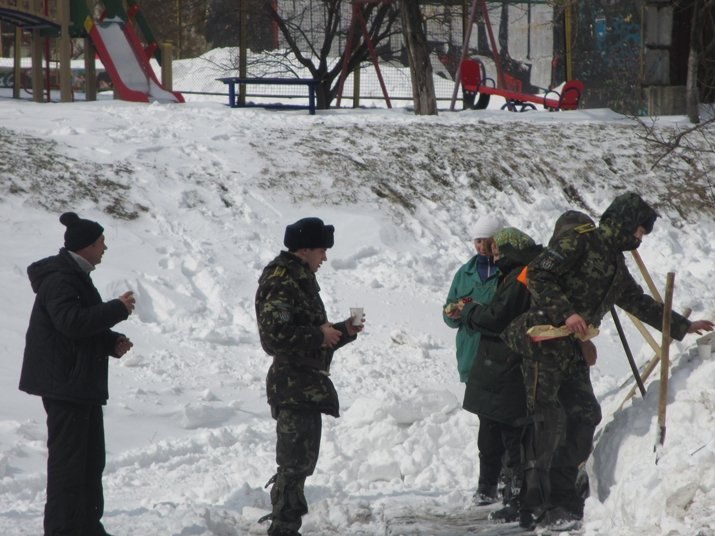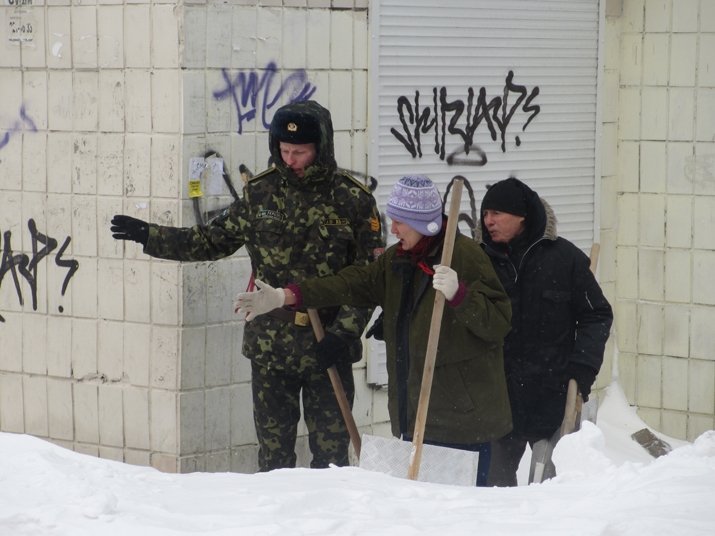 Пліч-о-пліч із двірниками працюють солдати-строковики.