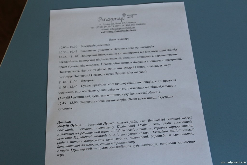 Йшлося і про те, як спростувати неправдиву інформацію, опубліковану в пресі. Доповідачі семінару назвали приклади зі світової юридичної практики та, власне, судових процесів, що відбулись на Волині.