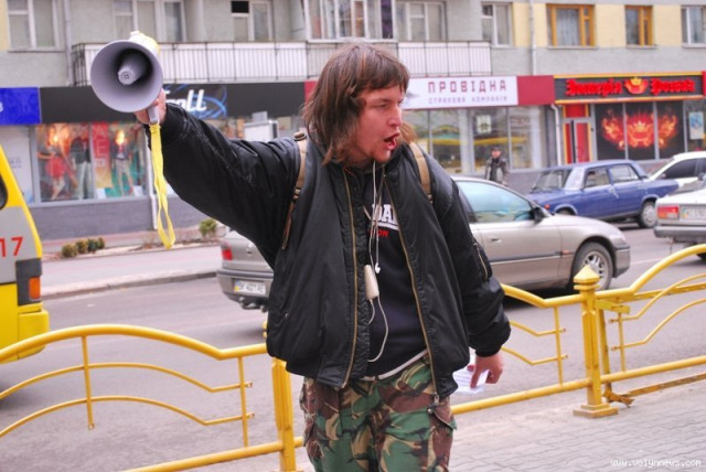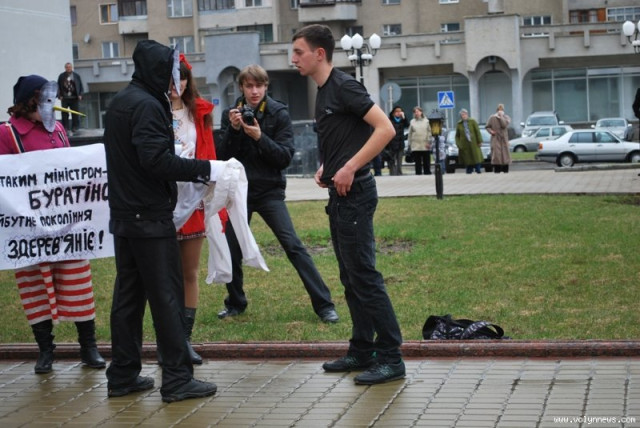 «Я зменшу вам стипендію… Зроблю так, щоб ви платили на п’ять років вперед. Виб’ю з вас рештки вашої національної свідомості. Я зроблю так, щоб була нова книжна з історії» - говорив переодягнений у Табачника учасник акції під стінами ОДА.