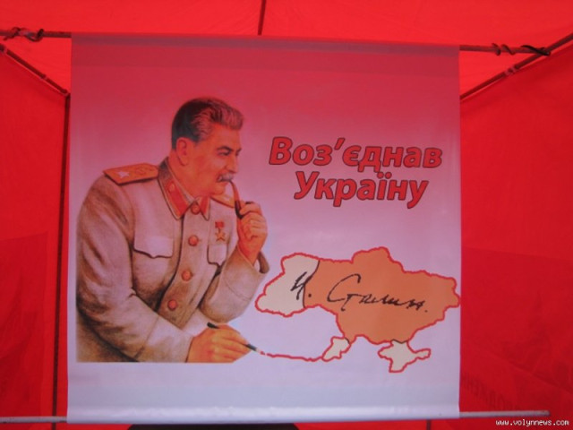 Те, що саме за Сталіна Україна набула саме такого географічного вигляду, який є сьогодні - це факт, який заперечувати є нічим іншим, як прояв дубизму та тупості. Читайте книжки. А стосовно поглядів - самі ж пишите і бачите - поряд стояла палатка "Свободи". Люди, ви ж самі на Майданах стояли за демократію та свободу, ви ж самі з правом сповідувати свої погляди. Так чому погляди інших мають бути виключно такими ж, як і ваші? Думка, що я лише правий, а інші - дурні - ідіотська по суті. Якщо є явище, до не повинно бути ставлення до нього. Повинне бути прости сприйняття його як об"єктивної, незалежної від нашої волі реальності. Просте лаяння - не аргумент. Якщо ця акція є, знчить є ті, хто вважає її за необхідну. І попри те, чи сто чи тисяча там гривень - вони там є. І це також факт. Я тут собі подумав, а скільки квадратних метрів приєднали вояки УПА до сучасної України? Нуль. І це також - факт.