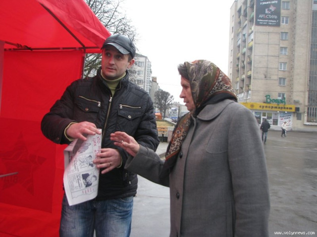 ...камрад на 4 фотке с усиками - это некто товарищ Селедцов. Лет эдак 10 назад он взял ссуду в банке и стал издавать газету "Волынь-Украина", но прогорел, в результате банк забрал у него квартиру. С этого момента партайгеноссе Селедцов стал отчаянным большевиком. За лучшей долей поехал он в Киев и там на Крещатике его повязали, обнаружив у него обрез. Что он хотел делать с ним во стольном граде - история умалчивает...Одно время на рынке продавал газеты. Теперь вот симпатяга Селедцов - борец за права трудящихся. Была у него еще неудачная попытка сделать обрезание и уехать в Израиль, но это уже другая история. С ком.приветом, Селедцов!