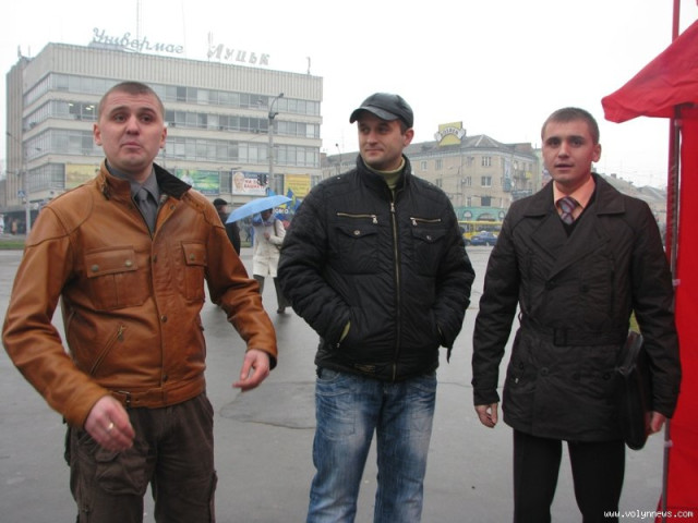 які ж це молоді волинські комсомольці. На фотографії представники однієї з молодіжних анархічних організацій, котрі за живі гроші готові на будь-яку роботу. ці агресивні та неврівноважені молодики взагалі то й не волиняни. бойовий загін революції. доречі кпу зараз на коні, бо отримують хороші гроші від свого калєтніка, який очолює митницю.