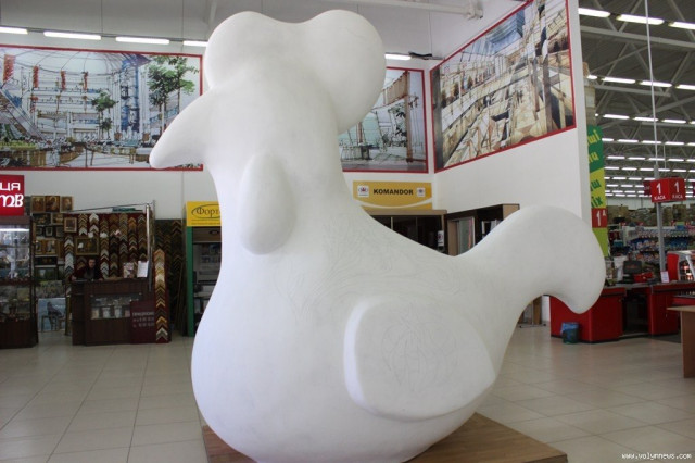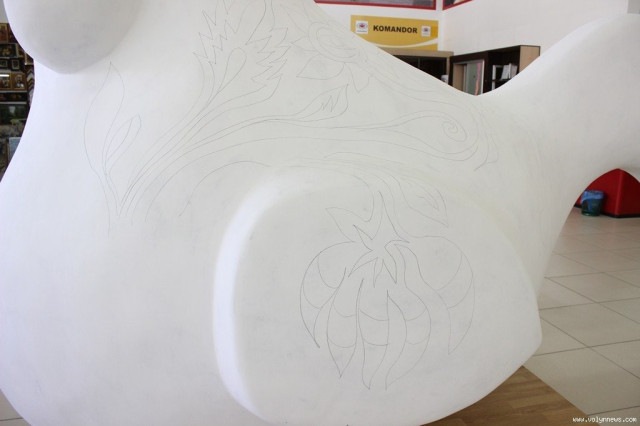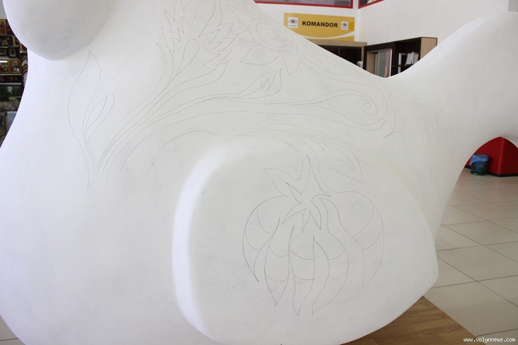 Прикрасить старовинним українським орнаментом волинську птаху відомий луцький художник Сергій Корсай. Начальник управління культури Луцької міської ради Тетяна Гнатів запропонувала меру Луцька Миколі Романюку поставити першу крапку на скульптурі як символ початку роботи. Однак той відмовився, мовляв, це - справа художника, а він на це не заслуговує. Тож, Сергій Корсай взяв до рук олівця і намалював невеликий елемент візерунку.