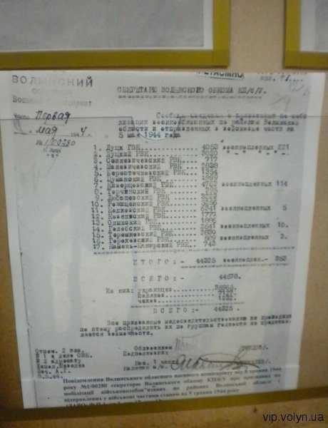 Також головний спеціаліст показала ксерокопію документа Волинського військового комісаріату, який датований 8 травня 1944 року. В ньому йдеться про призваних чоловіків на мобілізацію і військове зобов’язання по районах.