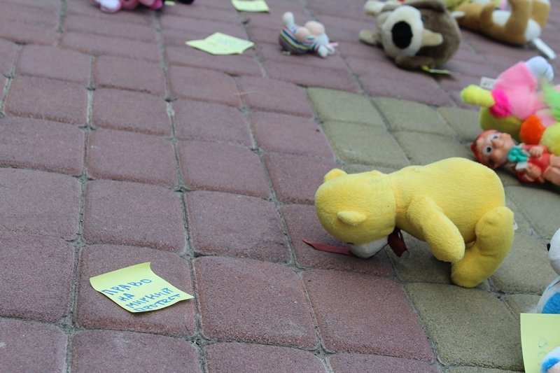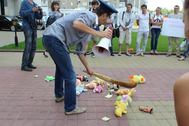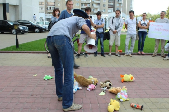 Учасники акції розіграли на майдані своєрідний перформенс. Виклавши на бруківку іграшки із написами на папірцях «Право на мирний протест» та «Ні – 2450», один з активістів «перетворився» на міліціонера та розмів віником усі іграшки у різні боки.