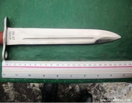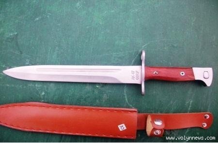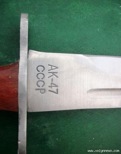 Під час спільного огляду було виявлено «ніж з металу сріблястого кольору, загальною довжиною 34 см, із двома вставками дерева, та написом на лезі «АК-47 СССР»» (довжина леза становить 23 см).