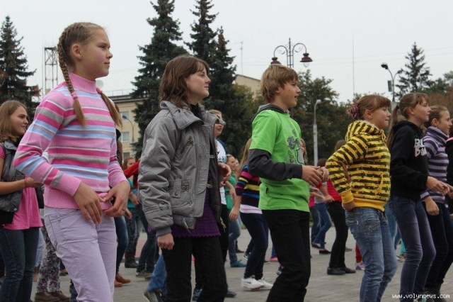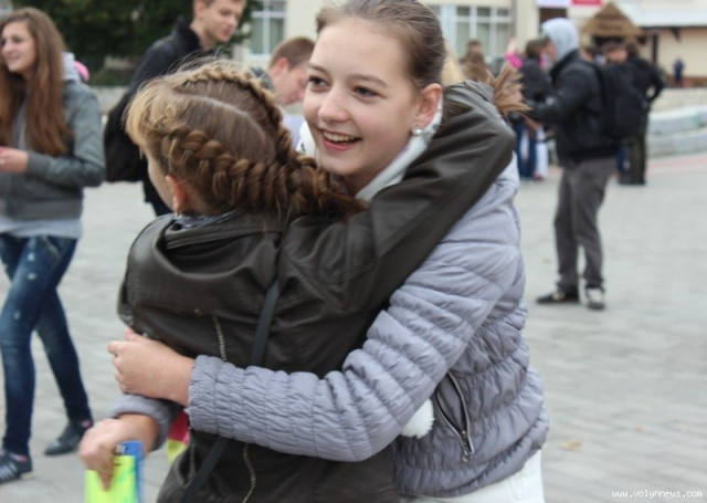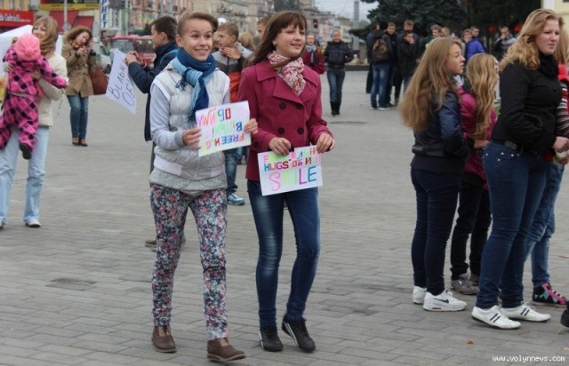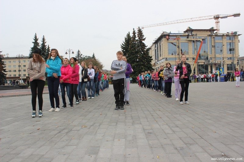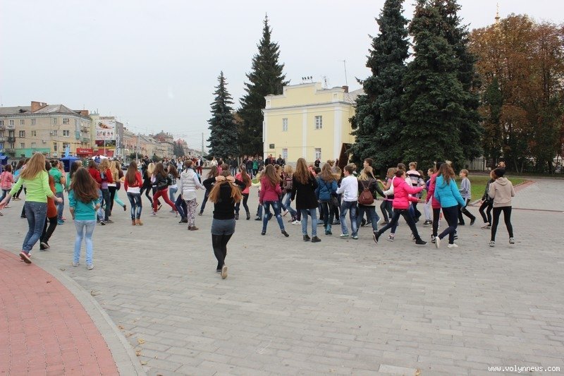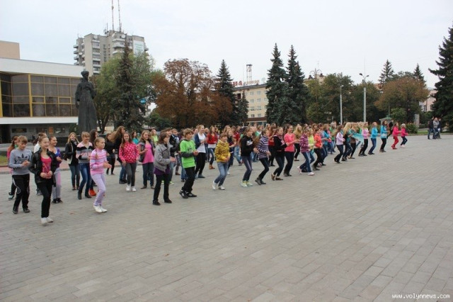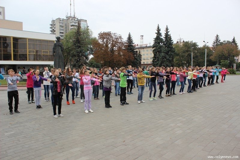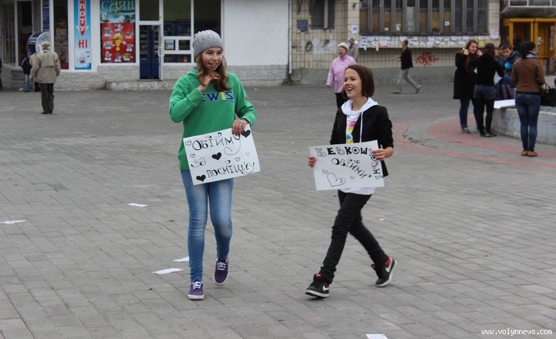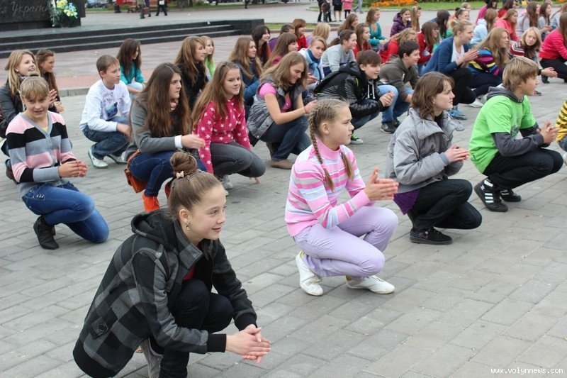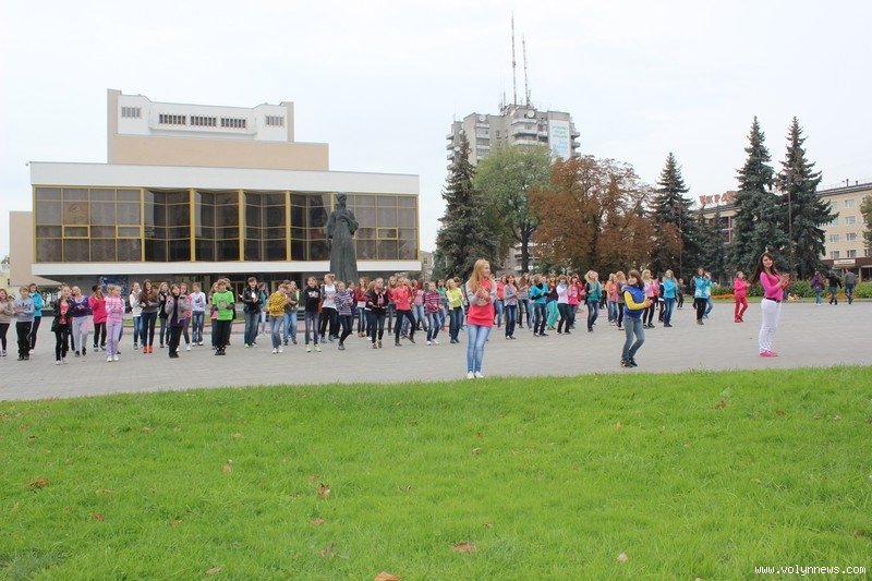 Понад 100 школярів та вихованців луцьких коледжів і училищ влаштували на Театральному майдані відразу два флешмоби. Потанцювавши, вони дарували лучанам «вільні обійми».