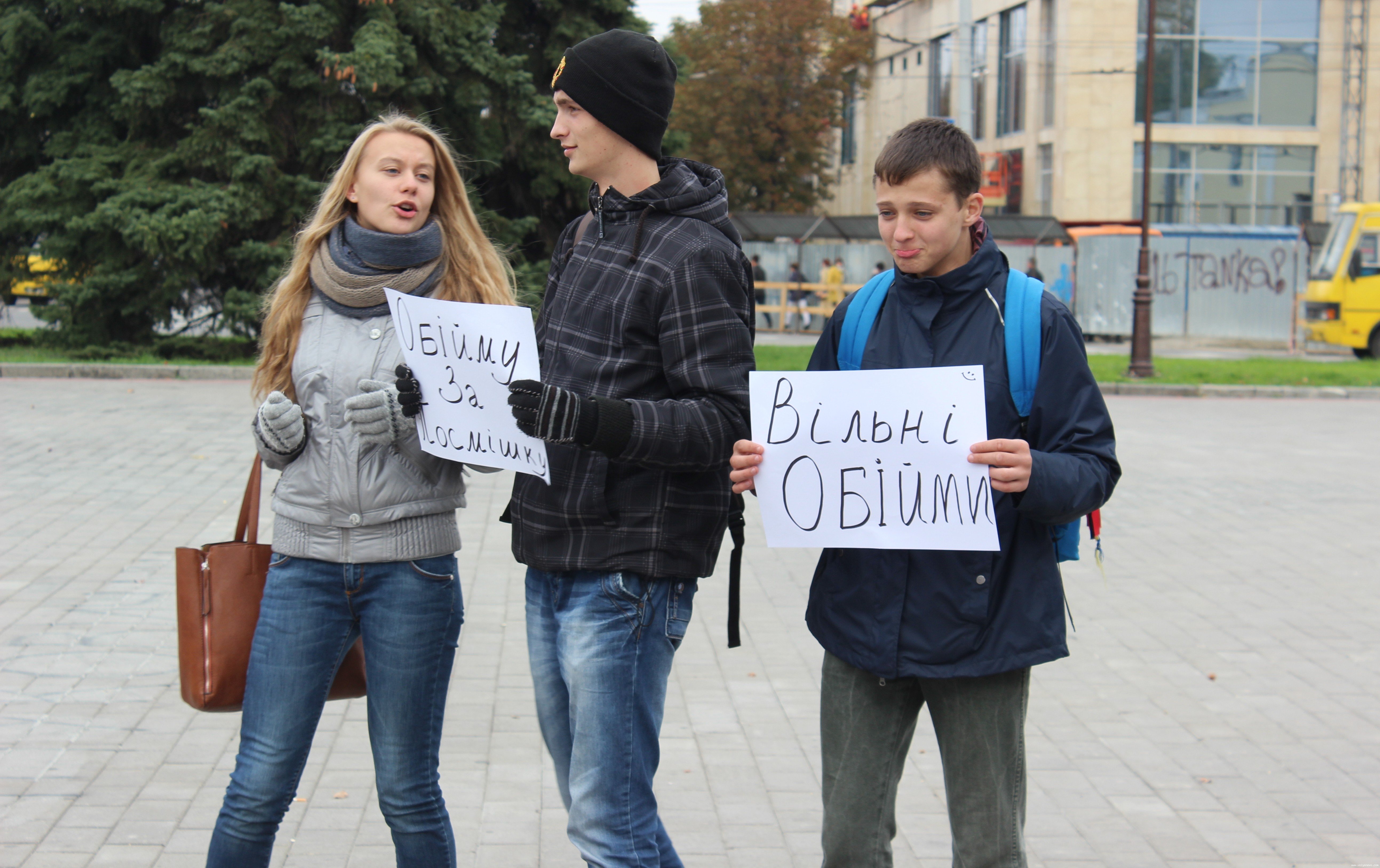 Потанцювавши, молодь не спинилася, а дістала таблички з надписами штибу «Вільні обійми», «Обійму за посмішку». Вони підходили до перехожих та пропонували їм обійми. Дехто сприймав таке проханням з подивом, але більшість з радістю погоджувалися.