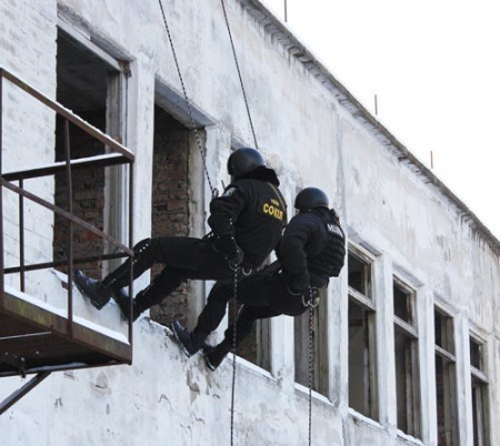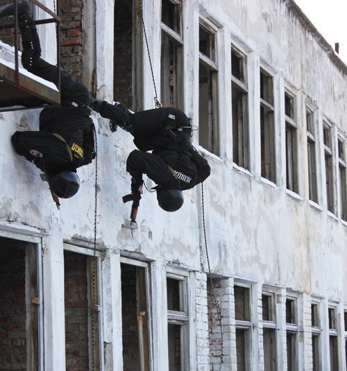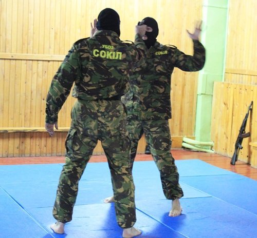 Знайомство продовжили бійці відділу швидкого реагування «Сокіл» на чолі із командиром підполковником міліції Володимиром Лотвіним. Одягнені у спеціальну чорну форму із масками на обличчі вони продемонстрували юним глядачам техніку проникнення до приміщень, у яких знаходяться озброєні зловмисники.