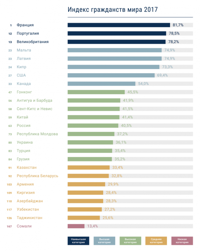 "20 квітня 2018 року вийшов оновлений Індекс громадянств світу (The Henley & Partners - Kochenov Quality of Nationality Index, QNI), який демонструє об'єктивну оцінку громадянств різних країн. Експерти ранжирували 209 громадянств за різними показниками за період з 2013 по 2017 рік", - йдеться в повідомленні.