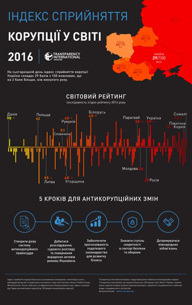 У Всесвітньому рейтингу СРІ (індекс сприйняття корупції) за 2016 рік Україна отримала лише 29 балів зі 100 можливих, таким чином, посівши 131 місце зі 176 країн.
