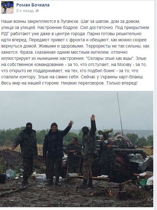 «Наші воїни закріплюються в Луганську. Крок за кроком, будинок за будинком, вулиця за вулицею. Настрій бадьорий. Сил достатньо. Під прикриттям РДГ працюють вже навіть в центрі міста. Хлопці готові рішуче йти вперед. Передають привіт з фронту і обіцяють, як можна швидше повернутися додому. Живими і здоровими», - передає радісну звістку Бочкала.