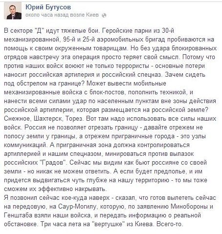 "В секторі "Д" йдуть важкі бої. Геройські хлопці з 30-ї механізованої, 95-та і 25-та аеромобільна бригада пробиваються на допомогу своїм оточеним товаришам. Але без удару блокованих загонів назустріч ця операція просто втрачає свій сенс. Тому що проти наших військ воюють не тільки терористи - основні втрати завдає російська артилерія і російський спецназ. Навіщо сидіти під обстрілом на кордоні? Може вивести мобільні механізовані війська з блок-постів, поповнити технікою, і нанести всіма силами удар по населених пунктах поза зоною дії російської артилерії, яка розміщується на російській землі? Сніжне, Шахтарськ, Торез. Ось там треба використовувати всі сили наших військ. Росія не дозволяє відрізати кордон - давайте відріжемо не смугу землі біля кордону, а відріжемо прикордонні міста - це вузли комунікацій.
