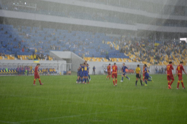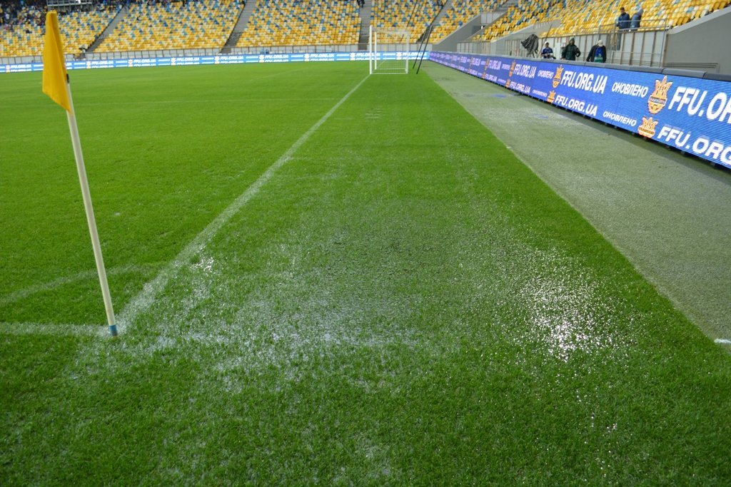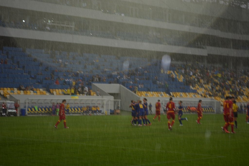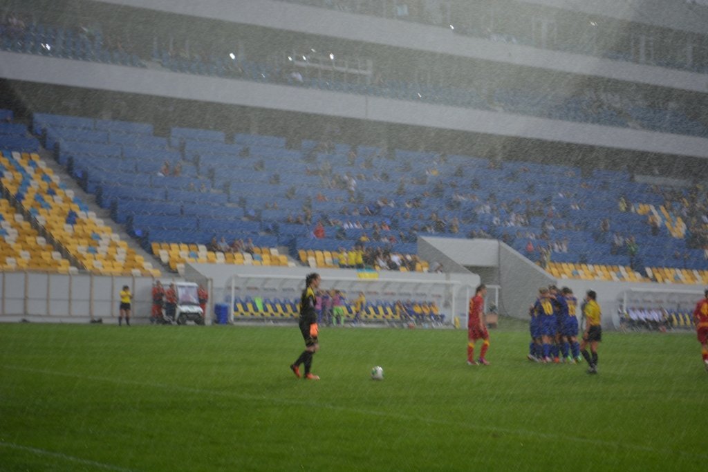Внесла свої корективи у гру і погода. З п’ятнадцятої хвилини розпочав накрапати дрібний дощ, який через кілька хвилин переріс у зливу. Однак під кінець першого тайму небо перестало «плакати».
