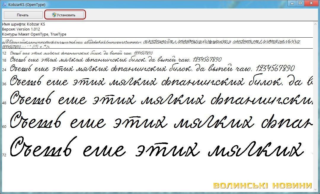 Для того, щоб інсталювати шрифт в операційну систему Windows, скачайте його з офіційного сайту за посиланням, розархівуйте файли, які містяться в архіві. Знайдіть файл KobzarKS.ttf, двічі натисніть на нього лівою клавішею мишки та виберіть пункт «Встановити» («Установить»).Після чого ви можете вибрати його серед списку доступних шрифтів у будь-якому текстовому редакторі.