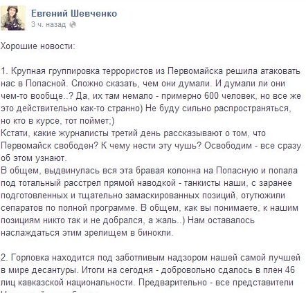 «Загалом, вийшла вся ця брава колона на Попасну і потрапила під тотальний розстріл прямою наводкою - танкісти наші, з заздалегідь підготовлених і ретельно замаскованих позицій, відпрасували сепаратів по повній програмі. Загалом, як ви розумієте, до наших позицій ніхто так і не добрався, а шкода..)