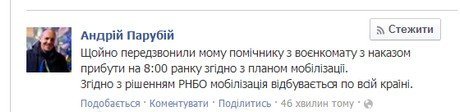 "Щойно передзвонили моєму помічнику з військомату з наказом прибути на 8:00 ранку згідно з планом мобілізації. Згідно з рішенням РНБО мобілізація відбувається по всій країні", - зазначає він.
