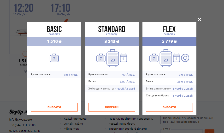SkyUp пропонує квитки економ класу за трьома тарифами: Basic, Standard і Flex.
