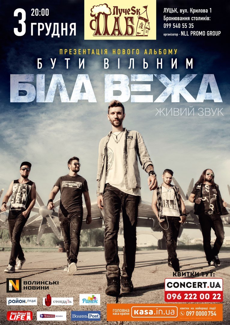 «Назва туру "Бути Вільним” - це енергетично потужна й кайфова назва, початкові літери якої збігаються із початковими літерами назви гурту. В цьому щось є. Біла Вежа. Бути Вільним. Про що співаємо у цьому альбомі? Про "місто, що вже не спить”, про те що "твій погляд наче безодня”, і "мов струм б’є - звук тиші”. А ще - "не здавайся йди, навіть сил нема коли”. Деякі пісні були написані під впливом канадського пост-гранджу та американського альтернативного року. А у деяких піснях - за своє взялася наша романтична натура і саме тому у альбомі вистачає балад та ліричних пісень. Під деякі пісні хочеться танцювати, деякі - просто слухати, а під деякі - несамовито відриватися.» - ось як самі музиканти характеризують тур. Незмінним організатором концертів гурту "Біла Вежа" у місті Луцьк є NLL PROMO GROUP . 3 грудня 20:00. Паб ЛучеSк. Попередній продаж - 80 грн.