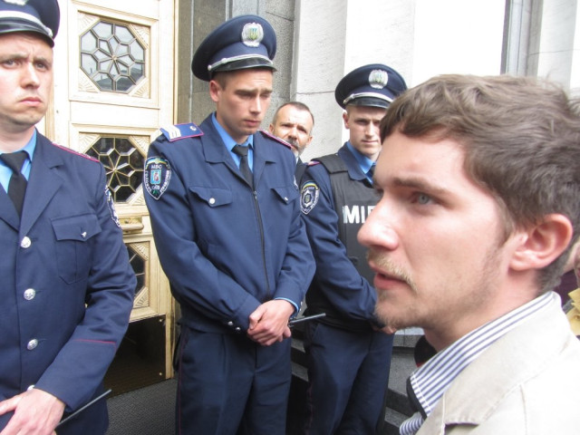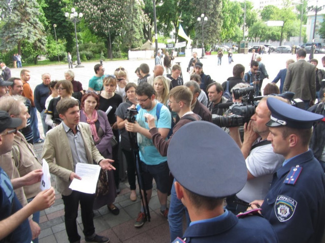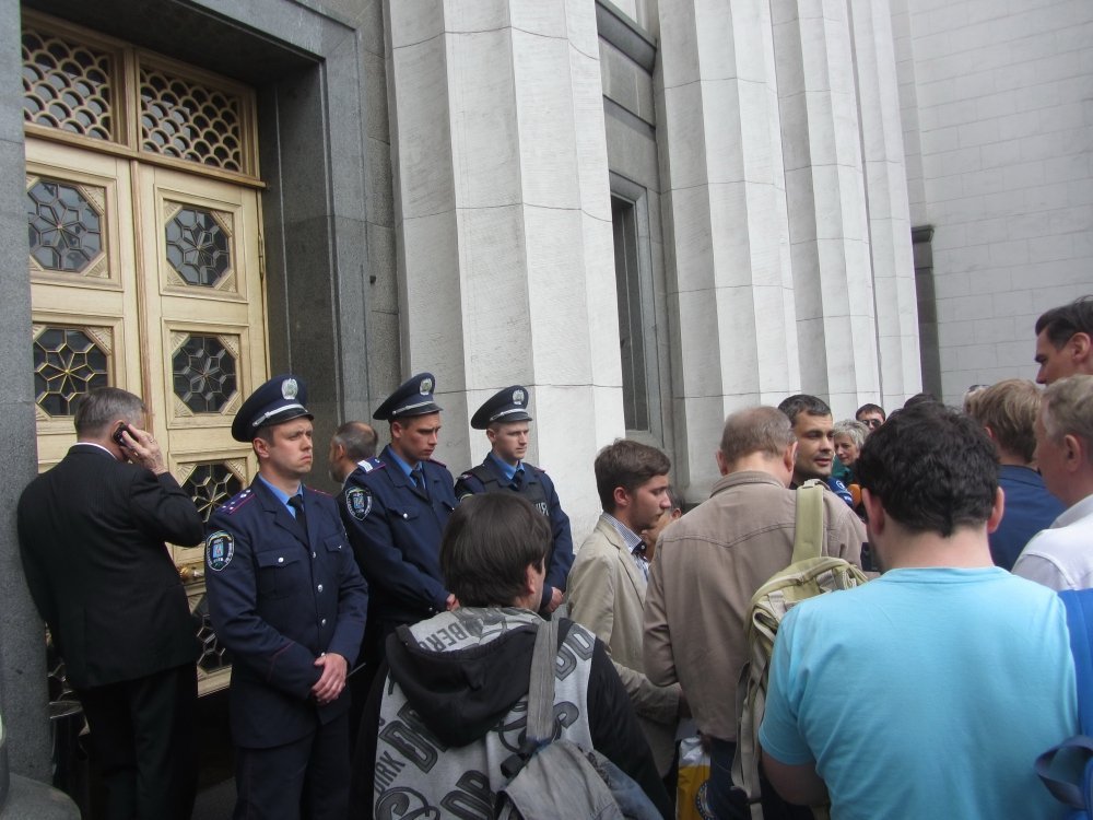 Близько 30 колишніх майданівців, українських патріотів пришли під парламент з валізами. Ці люди хотіли проникнути на нараду по проблемах східної України, проте їх у будівлю Верховної ради не пустили.