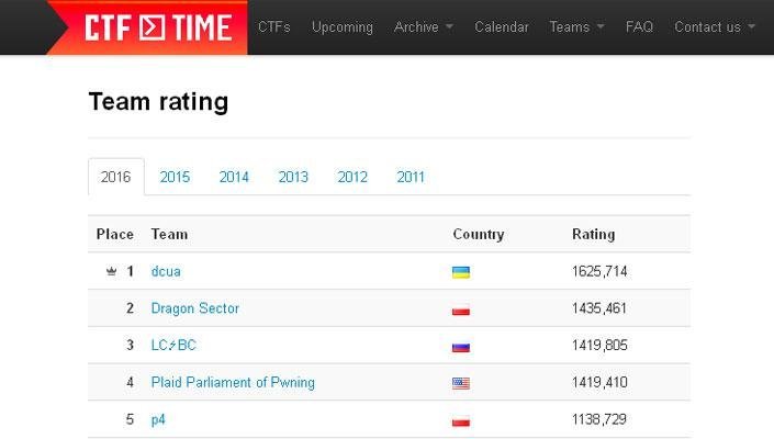 Команда КПІ ім. Ігоря Сікорського dcua визнана кращою з-поміж більш як 12 тисяч команд «білих» хакерів усього світу в рейтингу CTFtime у 2016 році, - інформує сайт КПІ.
