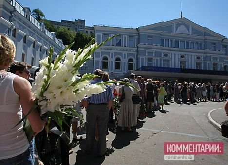 Черга охочих попрощатися з Богданом Ступкою вишикувалася в кілька рядів, огинає парк і розтягнулася до станції метро «Хрещатик» на десятки метрів.